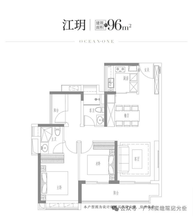 建面约96㎡竖厅:6.4米景观阳台+三开间朝南。