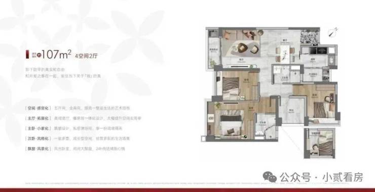 建面107平四房两卫,五开间朝南,经典竖厅设计,餐客厅一体化,每间房都有赠送大飘窗