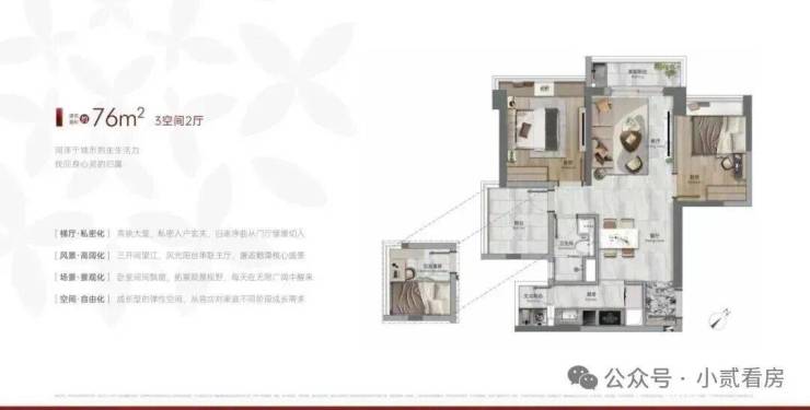 建面76-78平三房一卫,三开间望江,私密入户玄关,带生活阳台,主卧次卧都可望江
