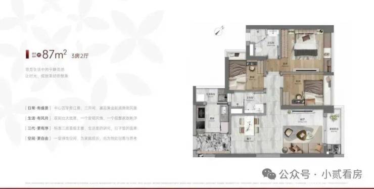 建面87-89平三房两卫,带主套设计,89平四开间朝南,三个房间带有大飘窗