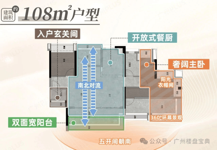 建面108平四房,带入户玄关,五开间朝南,还做到了南北对流设计,主卧带衣帽间。