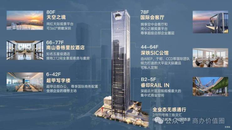◎约358米总部旗舰,总建筑面积约63万㎡,集建筑面积约10万㎡睿印RAIL IN、南山香格里拉酒店、深铁SIC公馆、超甲级办公、国际会客厅、天空之境等垂直功能于一体,集合全维旗舰配套,满足全时段商务需求。