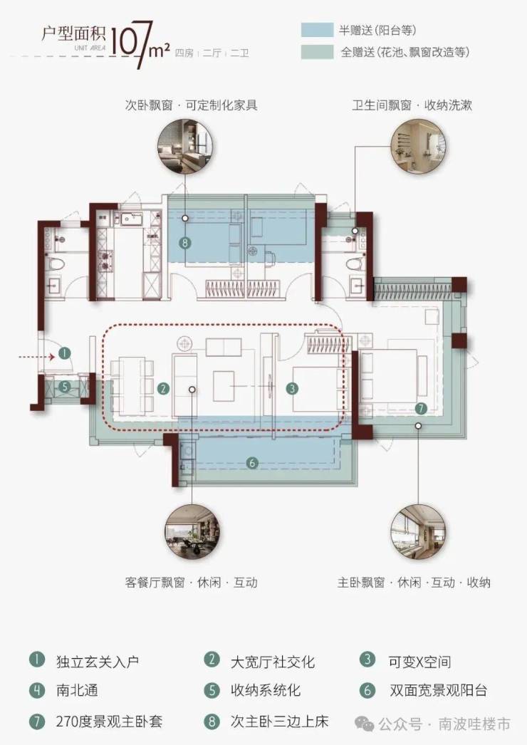 4.5开间朝南提升舒适度。全天候自然通风设计。中心化餐厅+灵活X空间,拓展生活场景。270度观景主卧套诠释精致生活,套房化设计强化舒适感。