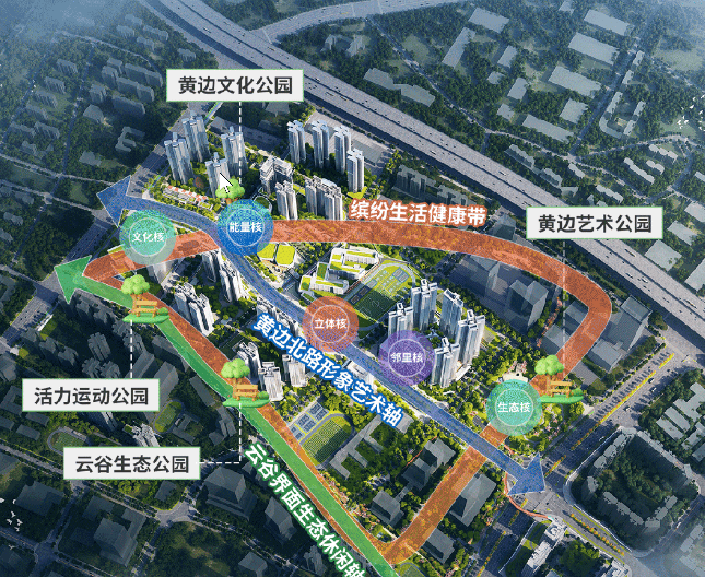 项目紧邻黄边艺术公园,未来将与黄边文化公园、活力运动公园、云谷生态公园四大主题公园相串联,形成自然与人文共生的活力空间。