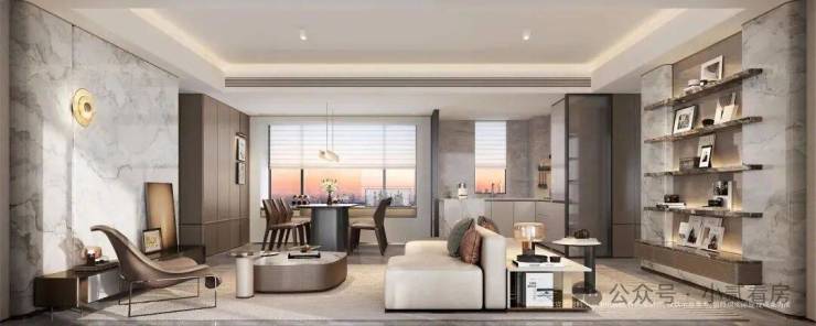最吸睛的是它的主卧去到28㎡,而且做了约12米长的270°无遮挡U型飘窗,室内光线敞亮,空间通透,非常有豪宅感。