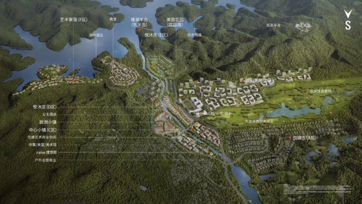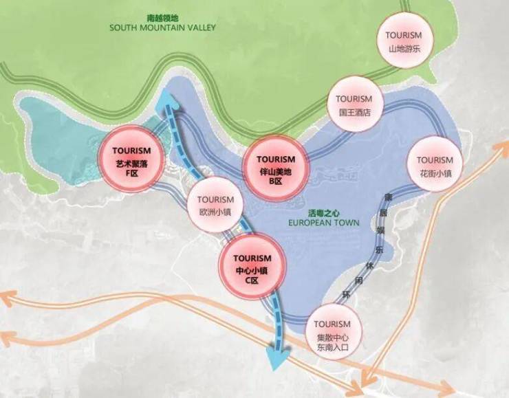 项目重点建设中心小镇C区、艺术聚落F区、伴山美地B区三大园区,并串联现状山地游乐、国王酒店、欧洲小镇与集散中心。