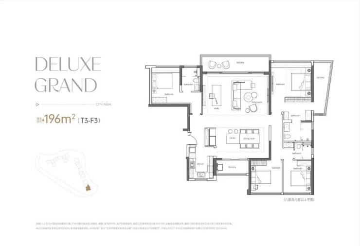 190方户型,四房两厅三卫双套房,T2组合、7米大阳台、9米阔卓厅堂、近55方餐厅,诠释了功能与奢适完美相融