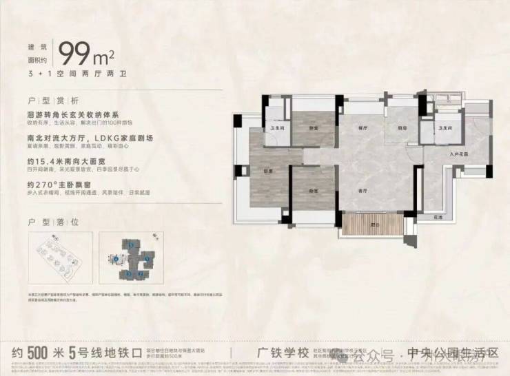 “中央公园”,紧邻大脚印公园,距离地铁约500米,紧邻学校、酒店