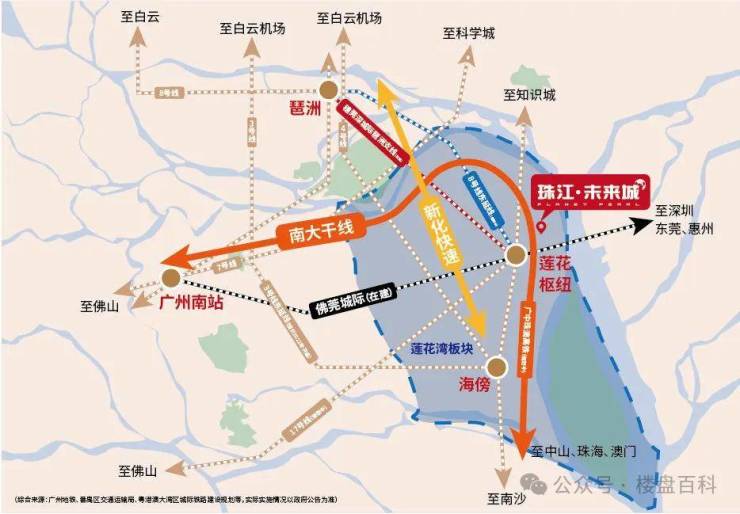 轨道——8号线东延段(规划)、17号线(规划)双地铁线路,区域还拥有佛莞城轨(在建)、穗莞深城轨琶洲支线(在建)、广中珠澳高铁(规划)三城轨,实现3站到琶洲CBD、万博CBD,4站到南站;