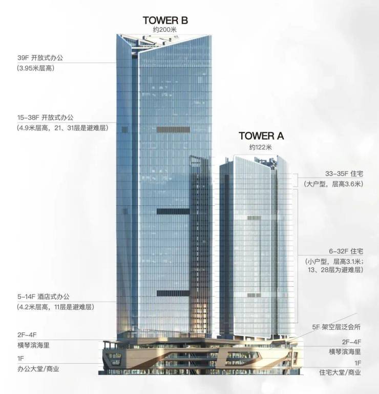▷整体业态:集商务写字楼、高端商业、空中会所,以及拥有70年产业高端住宅等多元业态于一体的金融岛尖地标综合体