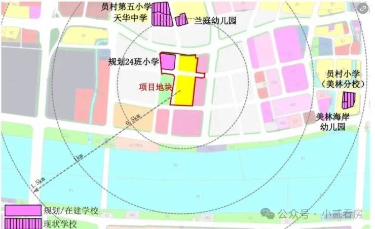 地块1.5公里范围内有员村第五小学、天华中学、兰庭幼儿园、员村小学(美林分校)、美林海岸幼儿园等。