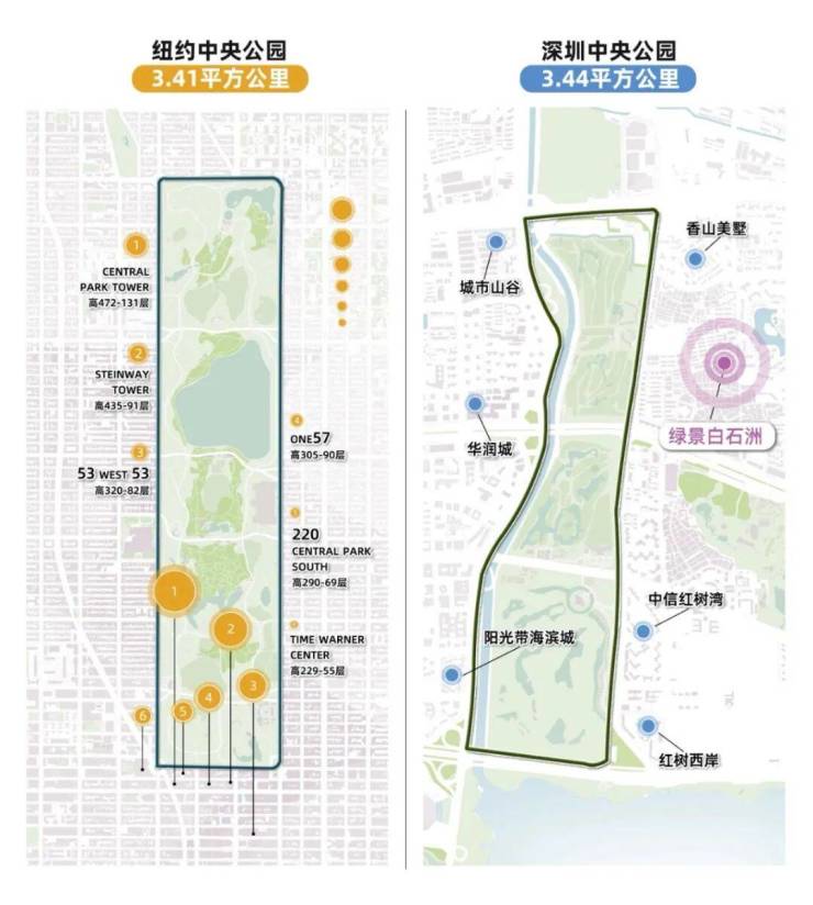 约3.4平方公里中央公园、约24万m2燕晗山郊野公园、约68.5万m2华侨城国家湿地公园、深圳湾超总十字生境、绿景白石洲约1.2公里中央绿轴,约15km滨海长廊,与华侨城三大主题公园,共同组成深圳超级公园带,每一次呼吸与远眺,都有来自国家级生态保护区的气息。