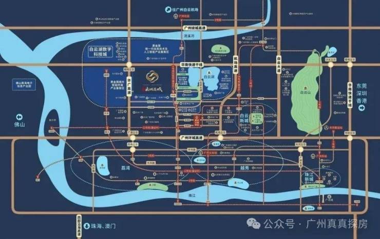 主干道交通路网主要分为三纵三横,东西向有广州绕城高速、华南快速和环城高速, 南北向有许广高速、机场高速和白云大道。快速接驳许广高速和华南快速, 30 分钟内快速到达白云新城、珠江新城、越秀、荔湾等中心区