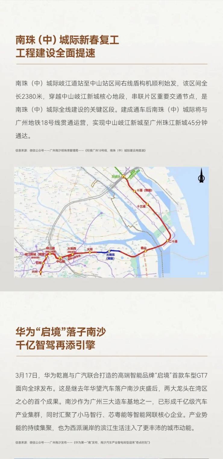 交通便捷性更是项目的核心亮点之一,依托横沥站与横沥东站双枢纽,串联起多维立体交通网络。距离地铁18号线横沥站仅数百米,作为国内首个时速160千米的全地下市域快线,18号线每日06:15至23:15运营,每隔7分钟发车,2站30分钟即可直达天河冼村,实现南沙与广州中心城区的快速通勤,10站可抵达珠江新城核心商圈。同时,地铁22号线南延段已开通,北承广州、东联深圳,进一步拓宽湾区通勤半径;规划中的地铁15号线、31号线、32号线及过江隧道,将实现1小时通达湾区9市2区,瞬息接驳世界。此外,项目周边规划的横沥东TOD,涵盖环岛智慧交通与高端商业中心,未来出行与消费将更加便捷。