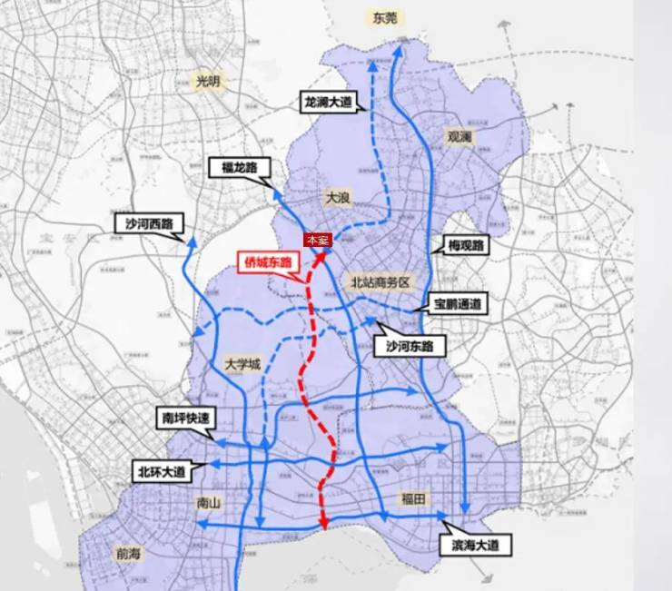 两主干:布龙路、龙峰三路:布龙路直达布吉,龙峰三路连接新区大道北段(预计23年8月通车)可直达北站红山片区