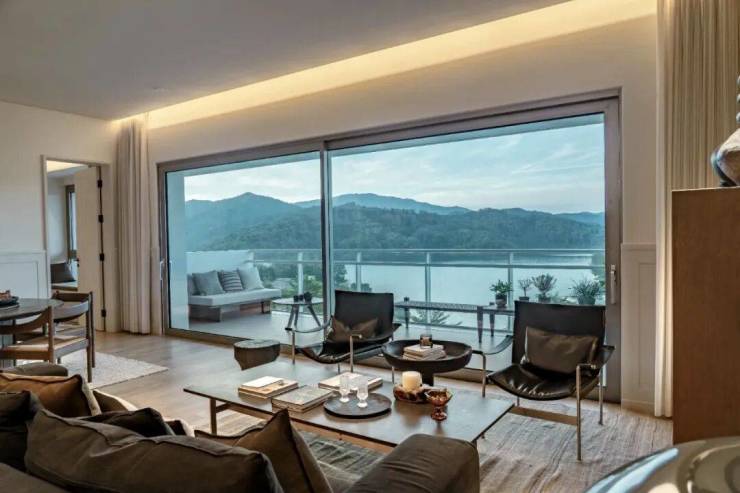 室内打造也很豪横,像超高挑空会客厅、酒窖、专业厨房、独立SPA桑拿空间、健身区等应有尽有,抬头见山,低头见湖,相当震撼。