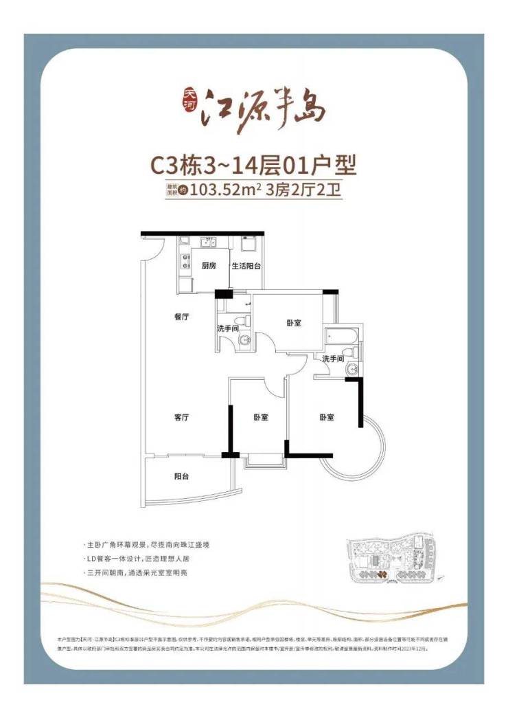 ✨建面约70-194㎡两至五房现楼发售✨🅣🅞🅟01户型【103㎡3房2卫】东南双面瞰江