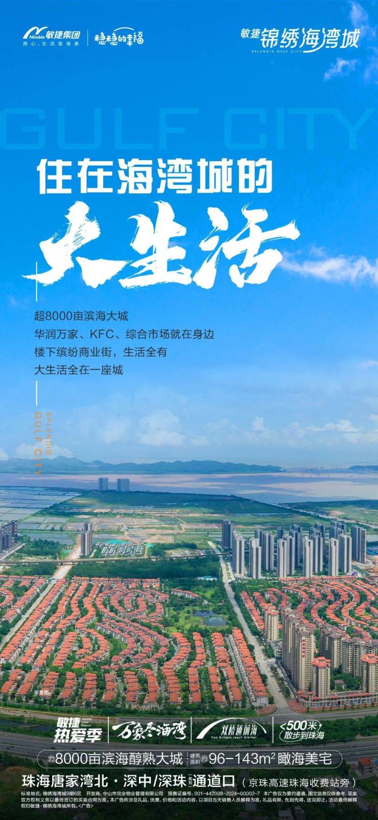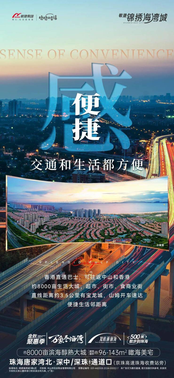 中山敏捷·锦绣海湾城,约8000亩滨海温泉航母城,产品涵盖洋房、美墅、办公产品、商铺等业态,规划居住约10万人,是万户业主的共同选择。小区配有香港直通车巴士、深圳穿梭巴士、082、932、66、k28等中珠公交,通达各地便捷出行。内部商超、学校、医疗、娱乐、交通等应有尽有,为业主定制超配生活;项目旁宝龙城商业中心,购物、餐饮等配套齐备,吃喝玩乐一城尽享。