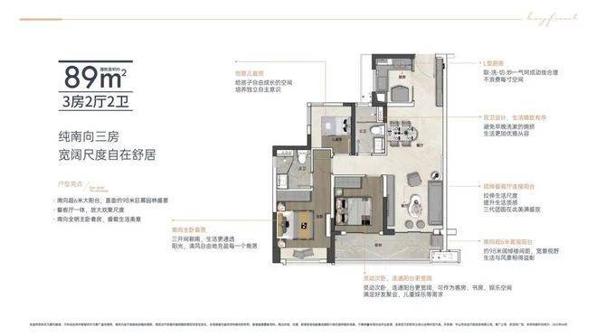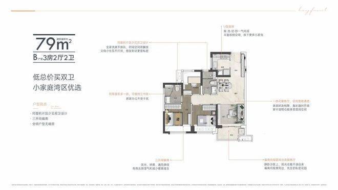 同等面积多出市面上其他产品一个卫生间。从单身到三代同堂,每个家庭阶段都能有舒适的体验
