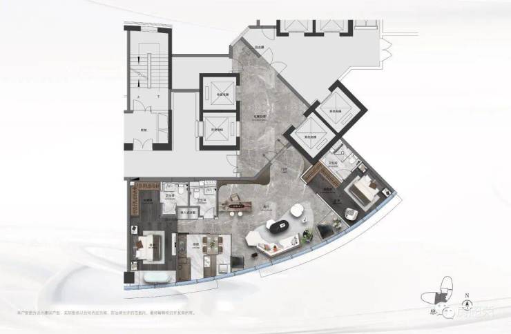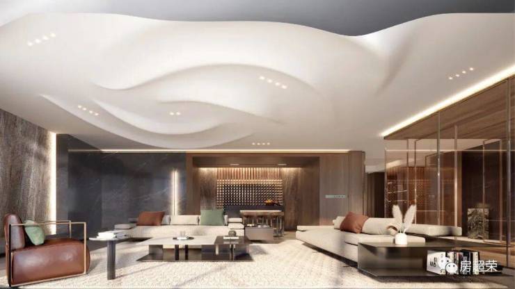全中空low-e静音玻璃幕墙和曲面建筑设计,勾勒出与珠江水呼应的泼纹曲线。光、水、空间,彰显品风临江大宅风范,空间处处彰显高定美学。