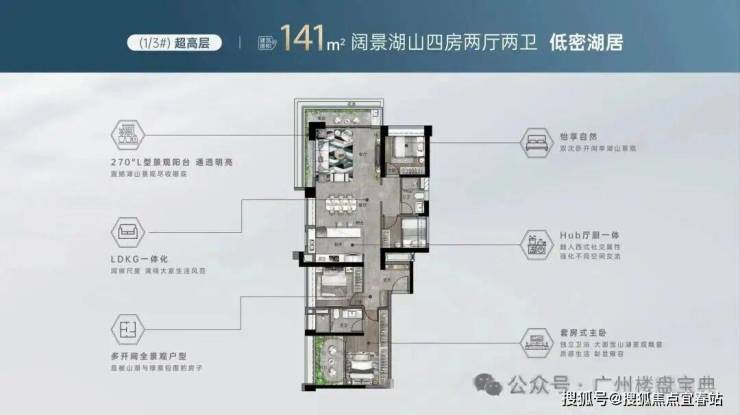 建面141平四房,LDKG一体化设计,270°飘窗把湖景尽收眼底。