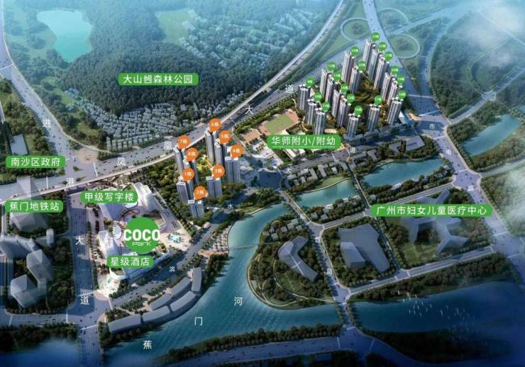 :背靠946万㎡大山乸森林公园,面朝2.3公里蕉门河生态景观,打造“揽山观河”的生态住区;