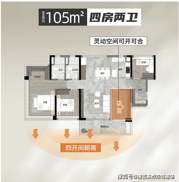 105㎡四房:南北通透单边户,三代同堂一步到位,动静分区合理。