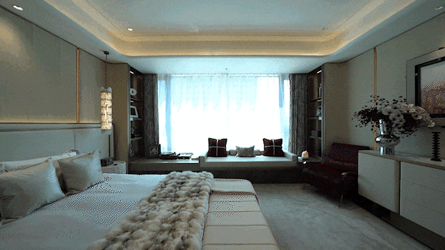 ● 观景模式:窗帘无声滑开,窗外的白云山与园林景致尽收眼底,让视野与心境一同舒展。
