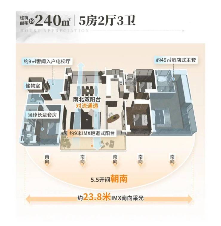 建面约240平四房3卫,标配约9㎡奢阔入户电梯厅。