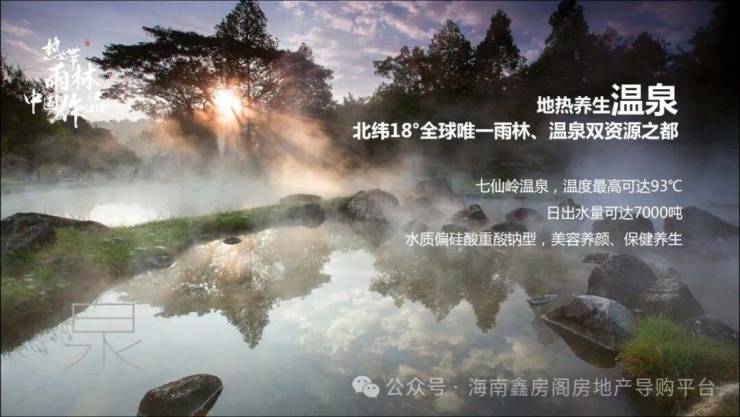 七仙岭的温泉闻名遐迩,是全海南岛最大的温泉之一,出水温度最高可达93℃,温泉水质属于偏硅酸重酸钠型,具有美容养颜、保健养生的功效。对于风湿性关节炎、痛风、心血管疾病、皮肤病都有不错的疗养功效。