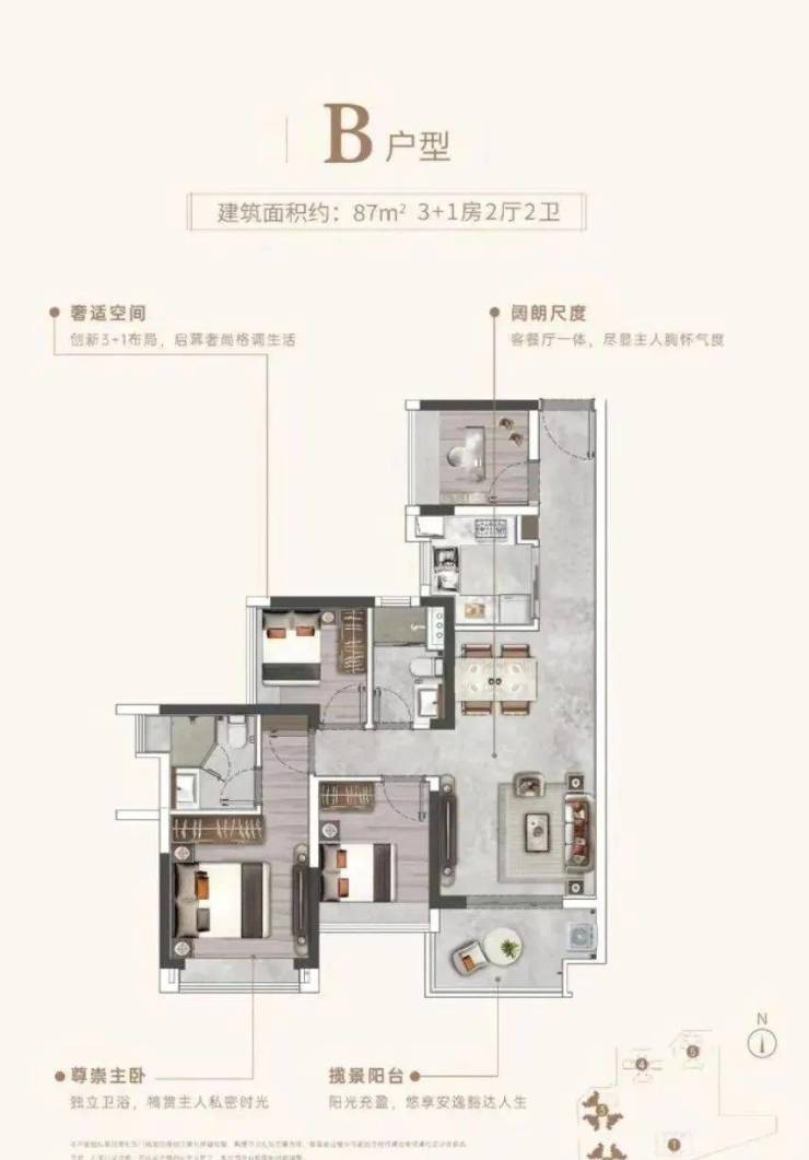 建面87平四房两卫,三开间朝南,带有主套,双卫浴干湿分离,同等面积多一房