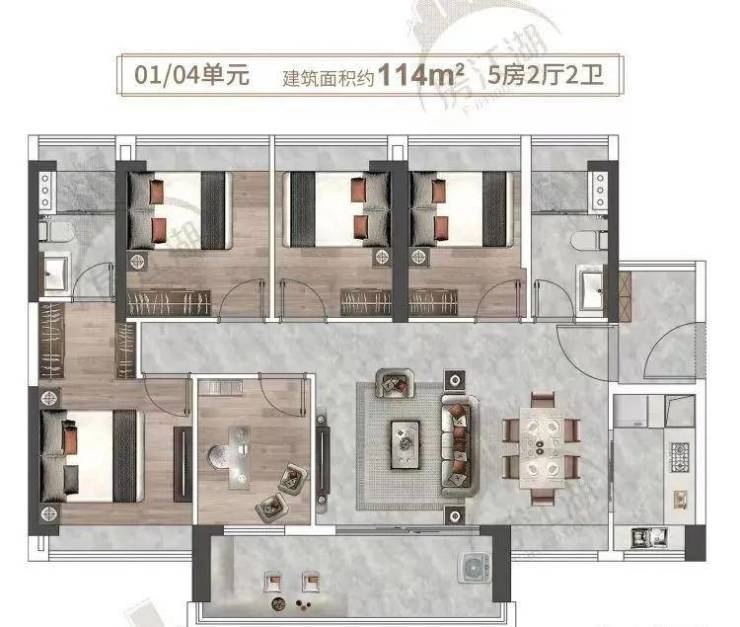 建面114平五房两卫,LDK一体化设计,四开间朝南,宽景大阳台