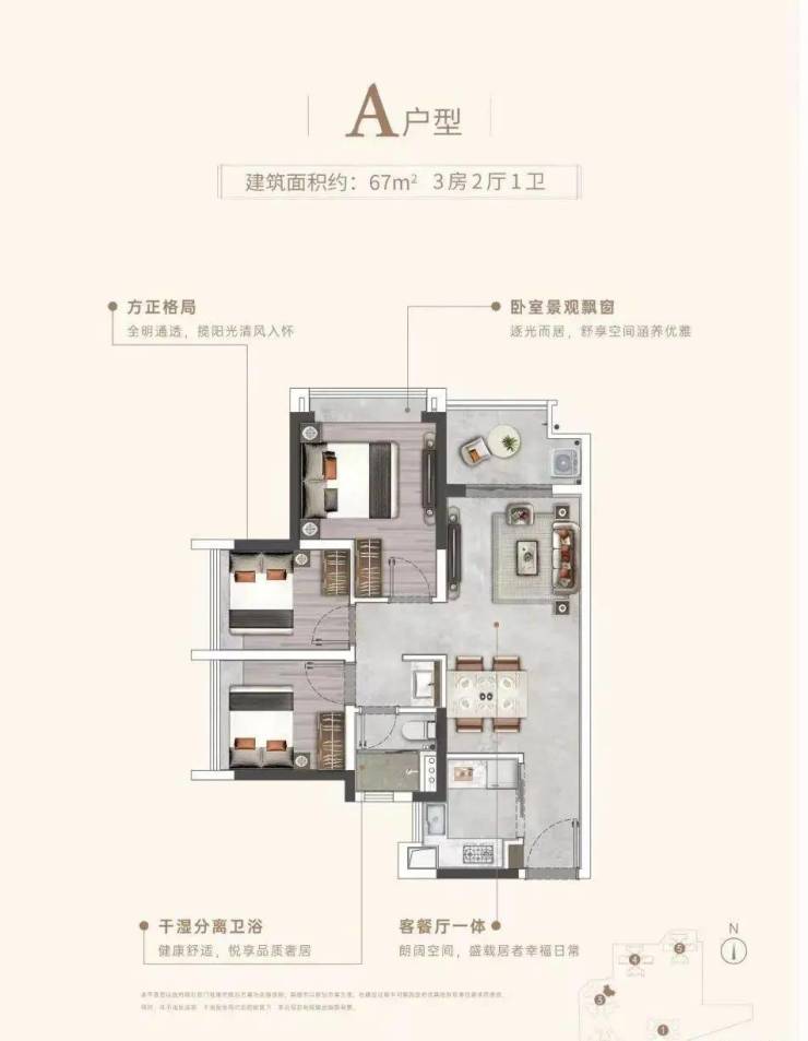 建面67平三房,厨房U型设计,3个卧室都有大飘窗,客餐厅一体化设计