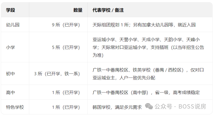 初中 🎓:3 所均为铁一系公办,仅面向亚运城业主招生,人户一致优先;按番禺区公办初中电脑派位 / 统筹入学,天际业主子女大概率进入铁一系初中,升学路径清晰、生源纯粹。