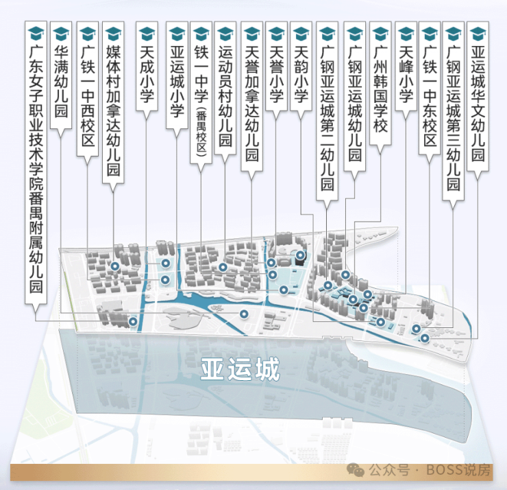 亚运城天际组团所在板块已形成幼儿园 — 小学 — 初中 — 高中的全龄教育闭环,以广铁一中(省一级)为核心,19 所学校均已开学,人户一致优先、生源稳定,接送半径友好。