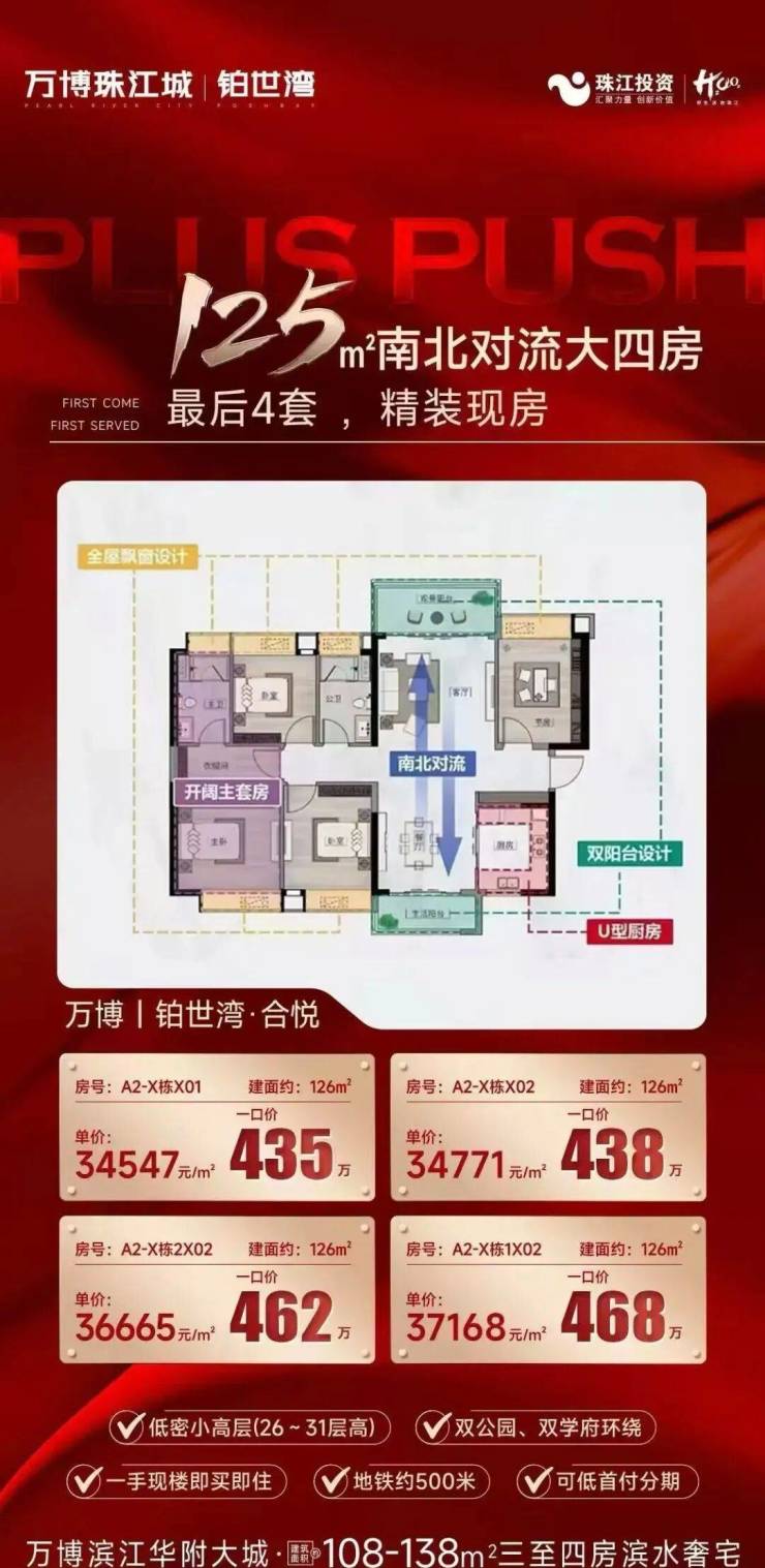 如今珠江铂世湾已经兑现了大部分,所见即所得。项目目前在加推建面约105-125㎡三至四房户型,三梯四户,全南向设计,并且精装修交付。