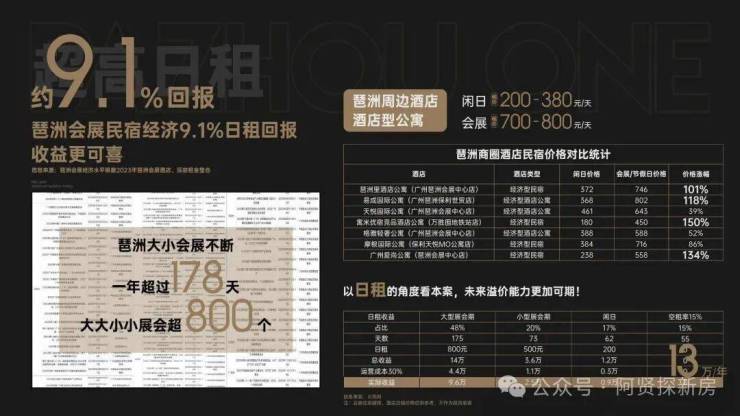 2023年琶洲展会全年举办800场,共178天,以会展租价计算,区域内商办产品一年最高可达13万/年超高收益,民宿经济约 9.1%日租回报 更可喜!