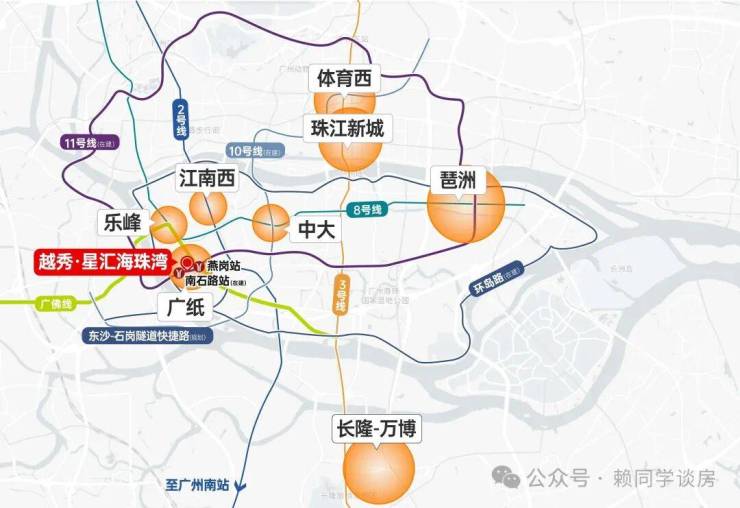 广佛线燕岗站,接驳广佛百万客流;环城线11号线(在建中)横跨海珠、天河、越秀、白云和荔湾五大主城区,连接广州火车站、广州东站等大型交通枢纽,发展价值无可限量。