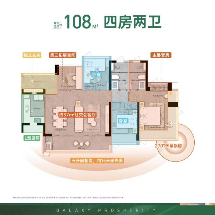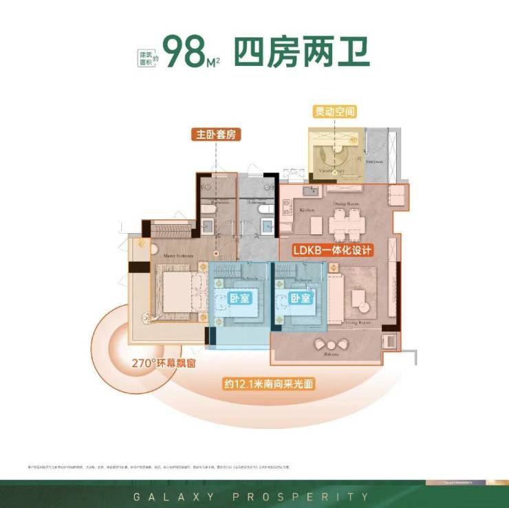 ◎ 四开间采光,270度环幕飘窗,预留S墙收纳,一体化大宽厅,开放式厨房