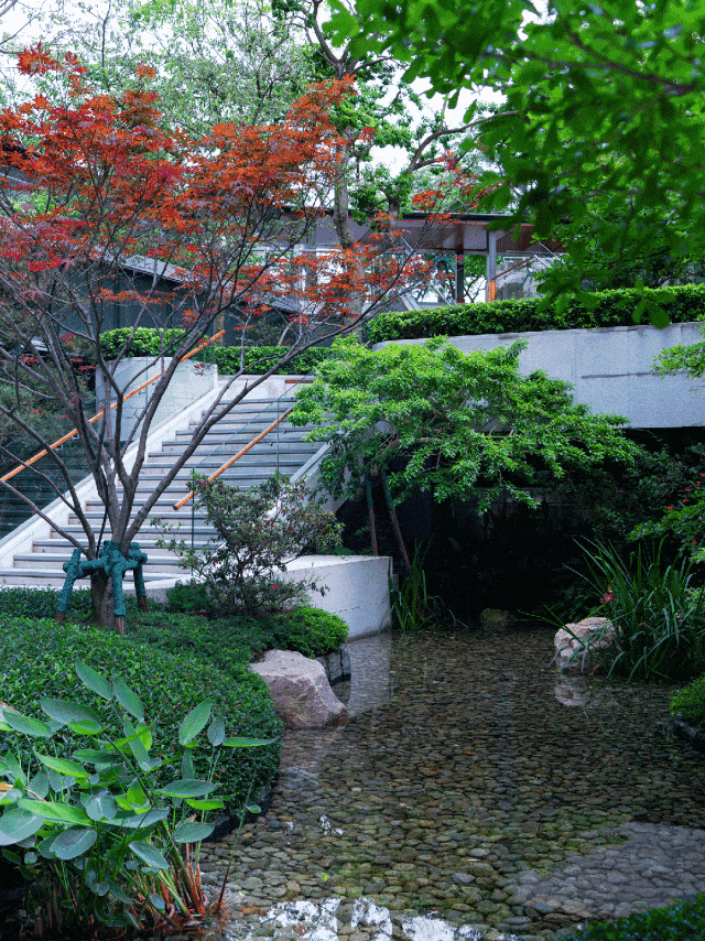 借鉴了枯山水的造景理念,在加上进口栽培、全冠移植的日本黑松、红枫等名贵树种,打造出了一处东方美学禅意园林。