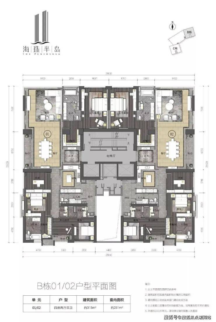 海珠半岛整体规划为B、C两栋,首层为10米挑高大堂,2F为会所配套,3-43F为住宅部分,户型为290-315㎡的四房。
