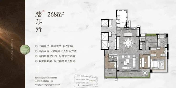 268m²的户型设计,三梯两户的设计,南向景观双阳台,让您尽揽东方园境的美景。站在阳台上,您可以欣赏到绿意盎然的园林风光,感受大自然的清新与宁静。同时,双阳台的设计也让室内空间得到了充分的延伸,增加了生活的乐趣与舒适度。