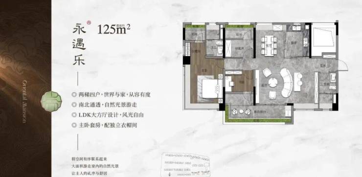 125m²的户型设计,两梯四户的设计,LDK大方厅设计是这款户型的一大亮点。它将客厅、餐厅和厨房融为一体,打造出一个开放而通透的公共活动区域。同时,大方厅的设计也让室内空间更加宽敞,视野更加开阔。