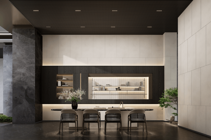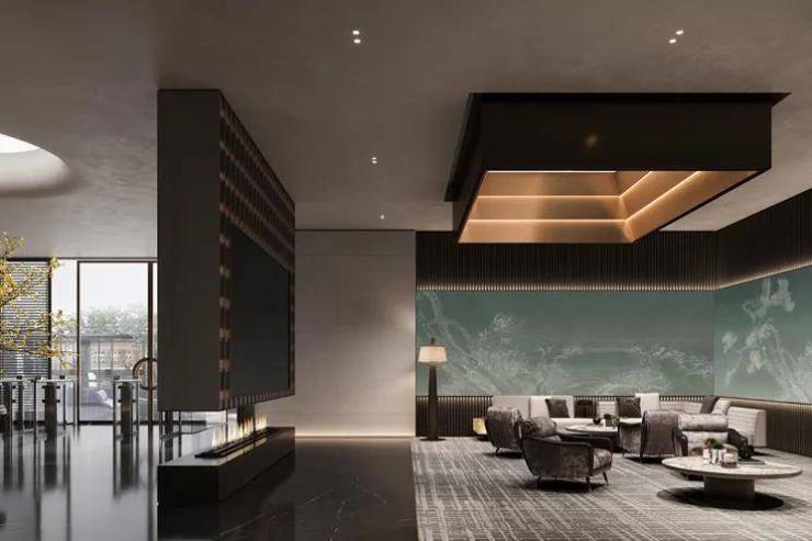 利用社区东大堂作为集中会所,植入接待区、咖啡吧、休闲书吧、共享办公等功能。根植岭南人文自然景观及名居特色,着力打造奢隐雅居。