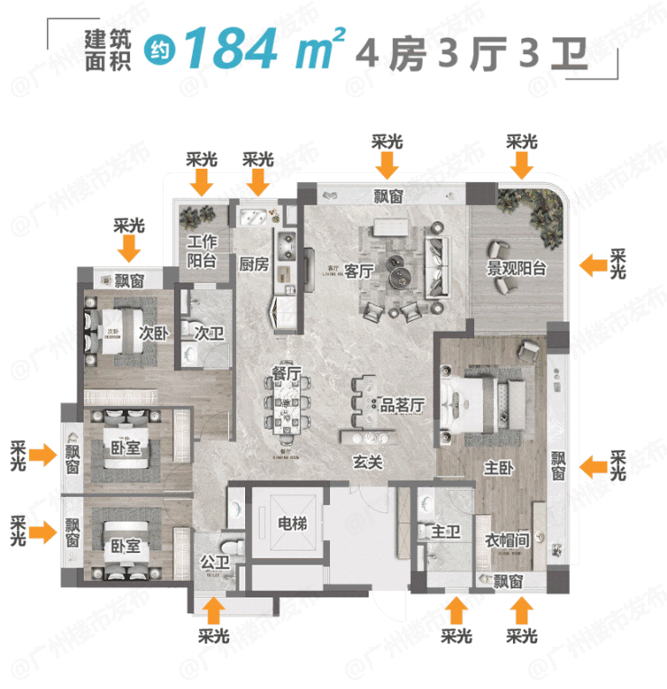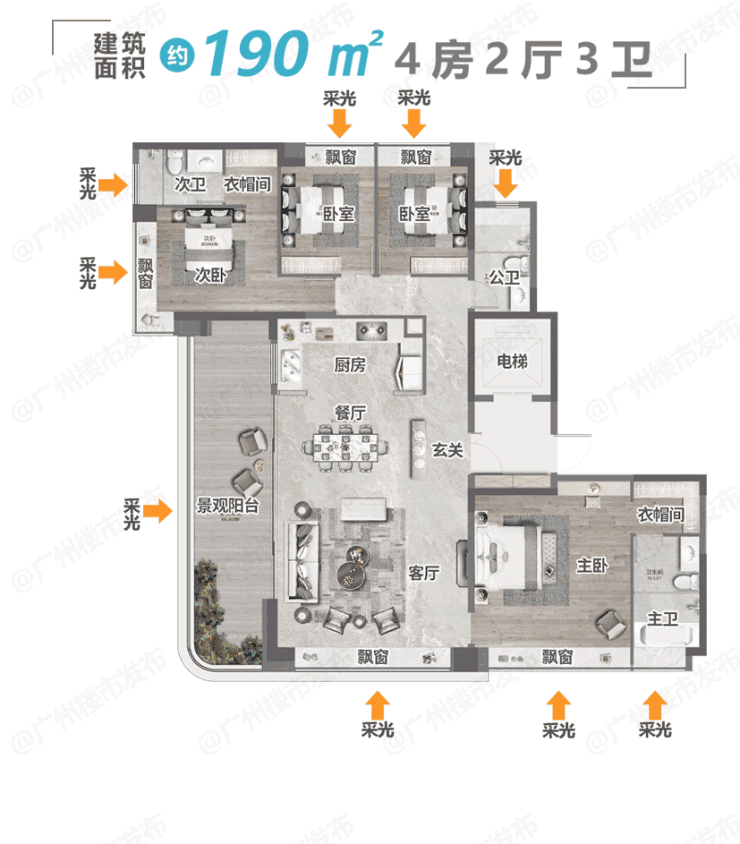约3.25-3.5米墅级层高,全广州最高大平层专梯专户,独立电梯厅,居住更纯粹!