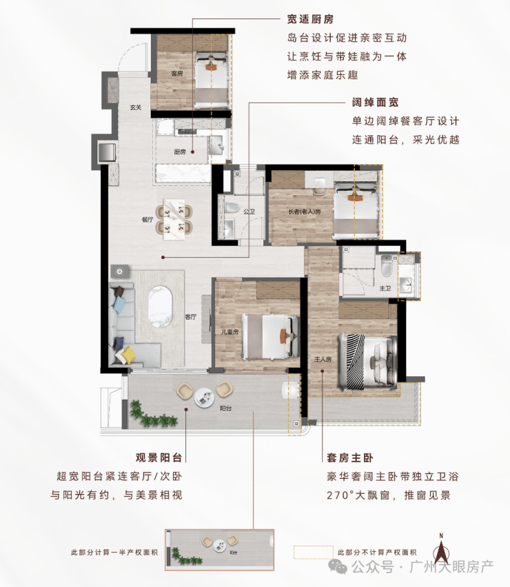 南北通透|主卧 270°飘窗+双飘窗|U 型厨房|南向观江景阳台