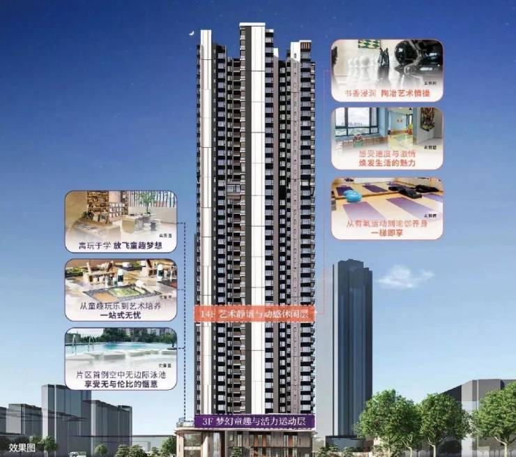 楼盘虽然体量偏小,只有一栋楼,但开发商也花了不少心思,活动空间不足新福港的解决方式就是双架空层做各种主题空间,尽可能的丰富化。