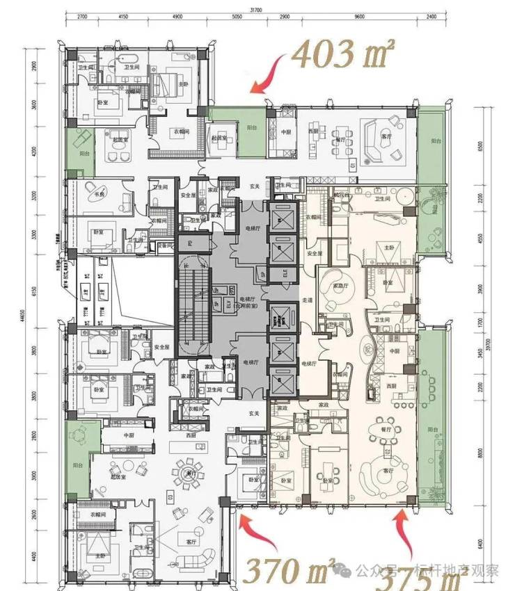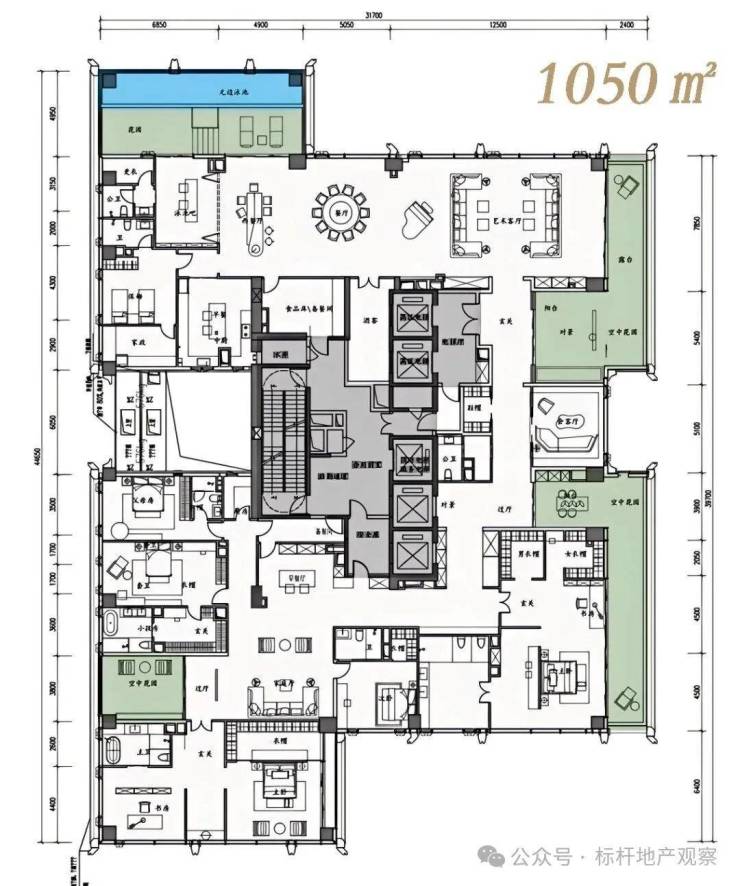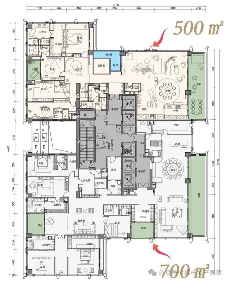 建面约500-700㎡,以及1050㎡顶奢大平层