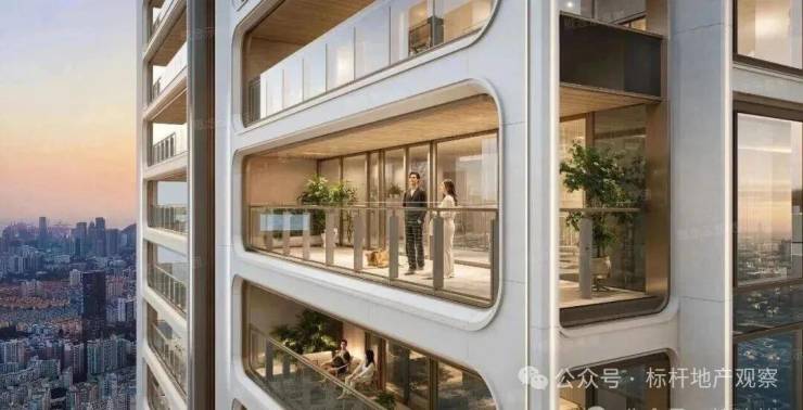 项目按第四代住宅标准打造,据说使用率可以达到92%以上。每户均带空中庭院,250米高空长出“空中院子”,第四代住宅概念第一次被深圳顶豪拿来溢价。