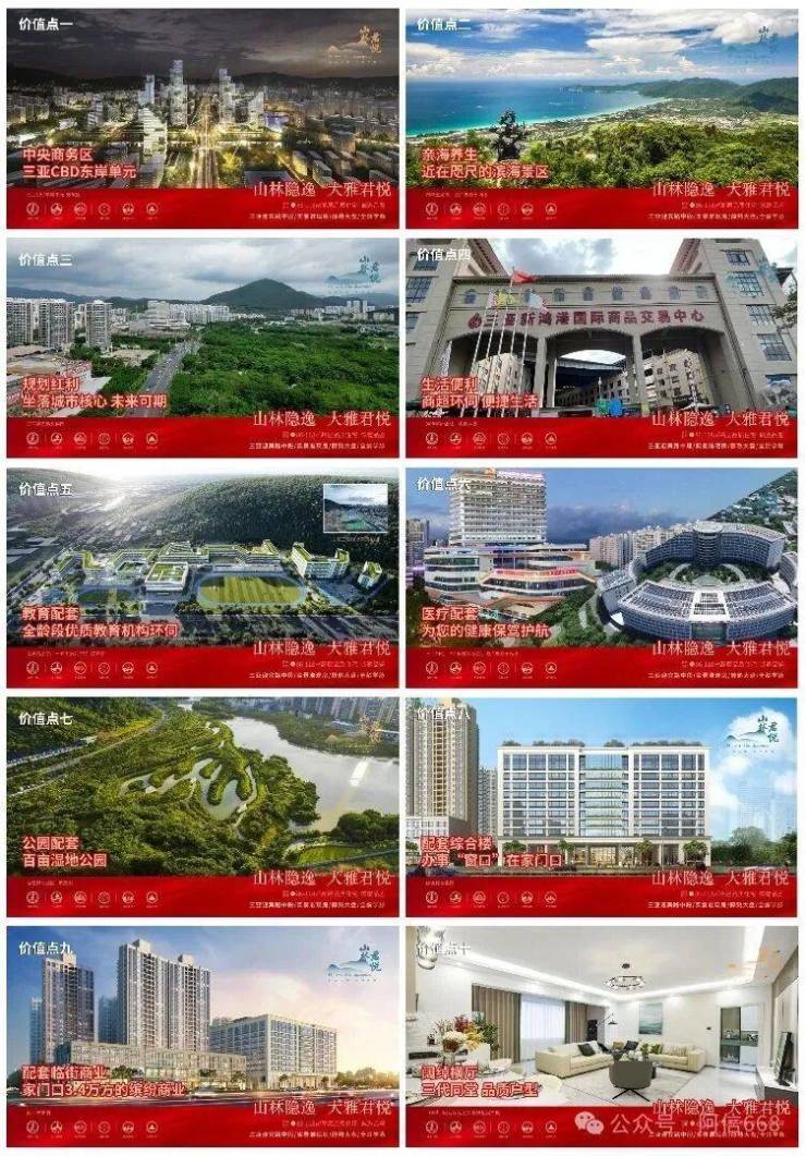 【配套】1⃣教育配套幼儿园:三亚市第七幼儿园(小区内)重庆巴蜀中学(12年制学校)2⃣生态配套:海螺岭、凤凰岭、虎豹岭3⃣市政配套:吉阳区政府、吉阳区湿地公园、三亚体育中心4⃣医疗配套:三亚市妇幼保健院、解放军301医院5⃣商业配套:中粮大悦城、三亚海旅免税城、三亚鸿港新Mall城、乐天城6⃣旅游配套:三亚宋城千古情、亚龙湾热带森林公园